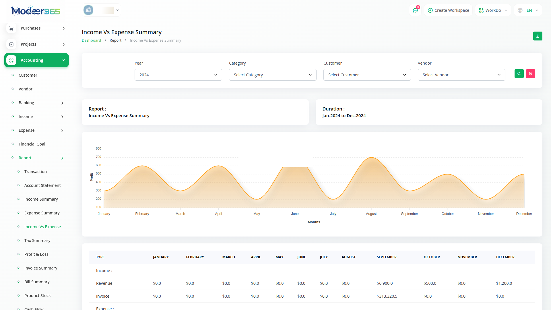 A budget is a financial plan for a specified period to keep in check with the working capital. This feature here helps to maintain the capital flow. You can set monthly, quarterly, half-yearly, or yearly budgets according to your business plans and needs. The main categories are “Income” and “Expense” where one can edit /update /delete the sub-categories as well.